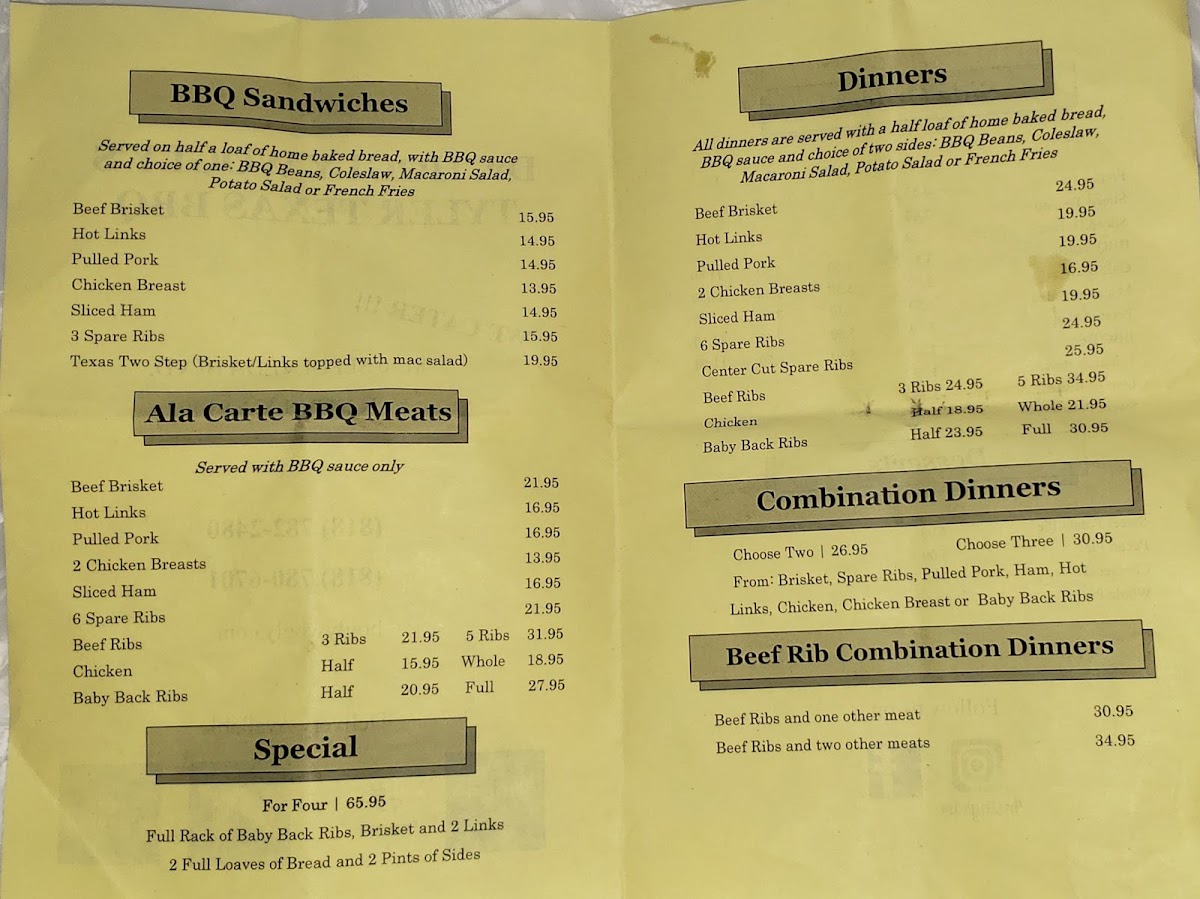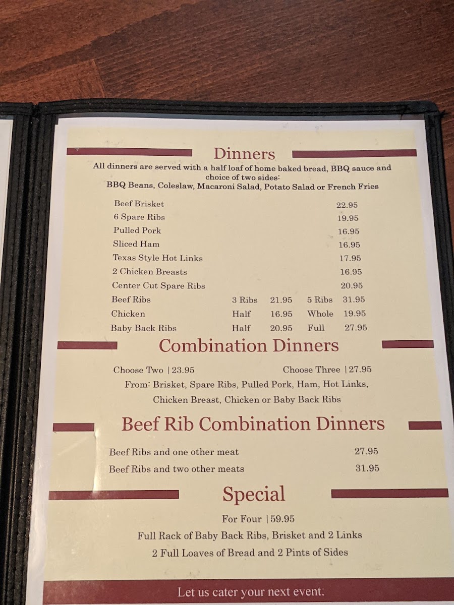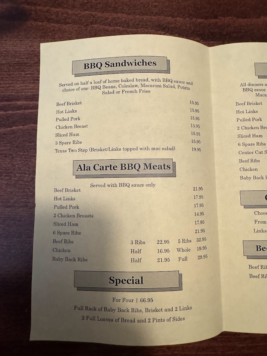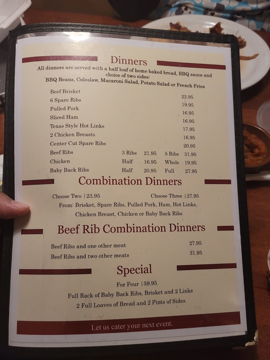 I usually get take out from here at least 1x a week. I treated my bestie for lunch a few weeks back and she loved it too. Some people might not like this spot , but I love it . They give huge portions of meat. The 3 meats dinner is my favorite and I usually have left overs for the next day. The bbq sauce is tangy and has great flavor. The baby back ribs , forget about it. Fall off the bone meat and so tender. Never dry. The texas hot links have the perfect amount of heat without scortching your mouth.. The brisket is my favorite. So tender and flavorful. My 1 and only complaint, if you wanna call it that , is that they don't have greens (collard greens) on the menu lol. Definitely check out this spot if you're in the area.