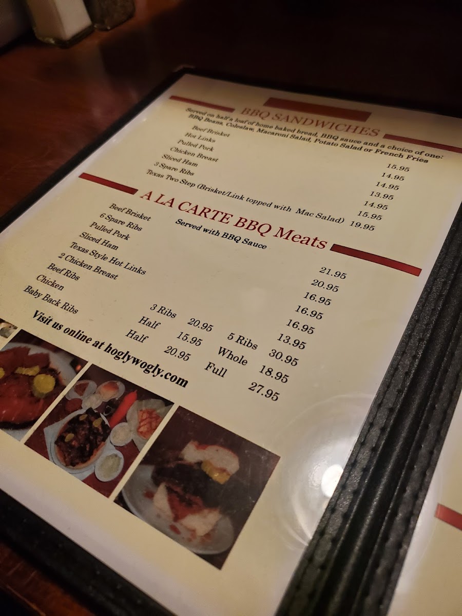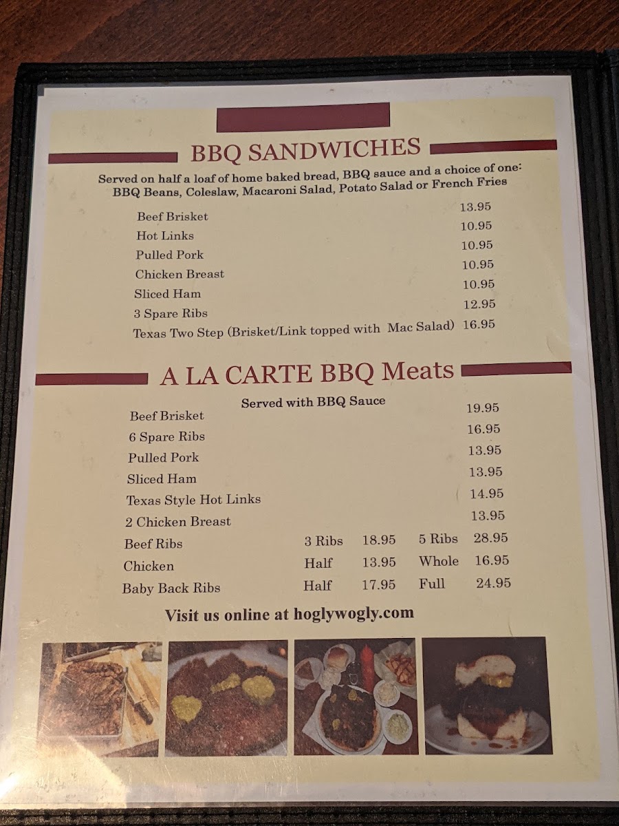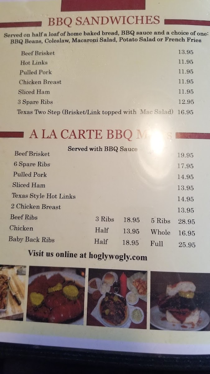 I recently visited a new barbecue place that opened up by our house that offers Texas style BBQ. It was good, but very pricey. I say it was good but not as good as Hogly Woglys. I've been going to this restaurant for over 50 years. We don't live in the area anymore but anytime I drive through town, I stop and pick some up. Hands down the best beef ribs I've ever had. I absolutely love their barbecue sauce. Too many other places add an overabundance of vinegar and sugar. There's is too perfection. The atmosphere is dated but cozy and always clean. This restaurant has and always will be my go-to for good, authentic, Texas style barbecue.
